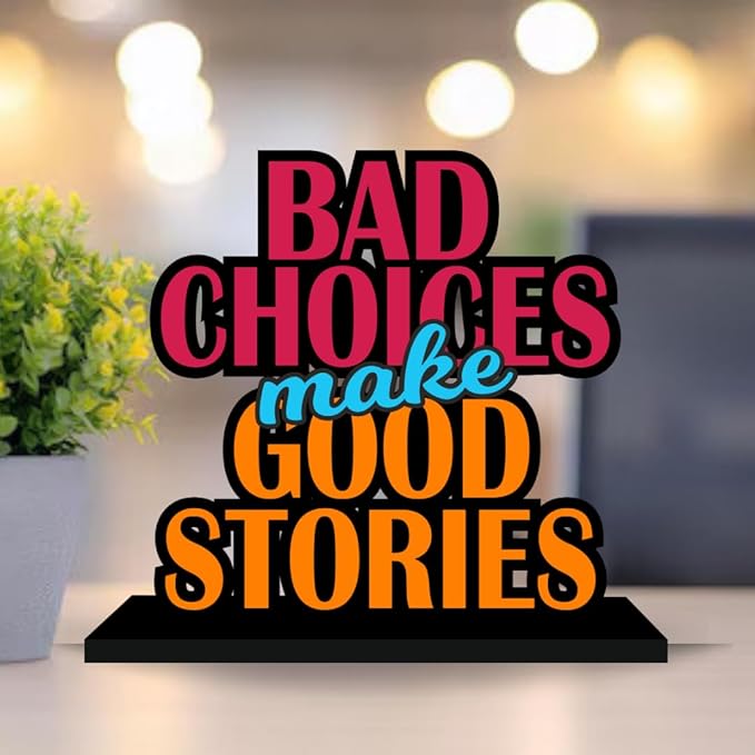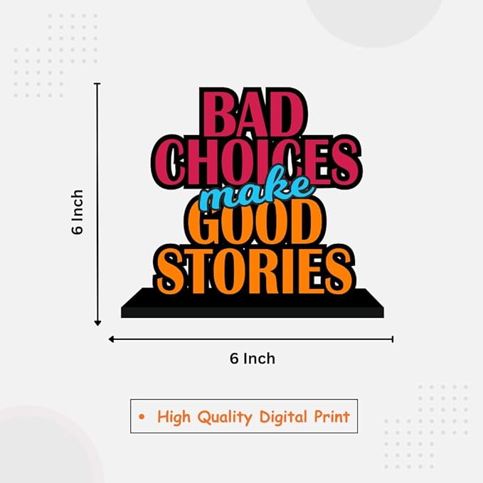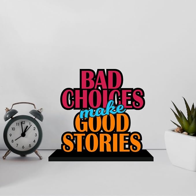 - Motivational desk decor with the empowering quote ” Bad Choices Make Good Stories”—perfect for inspiring effort, positivity, and stress-free achievement at home or work.